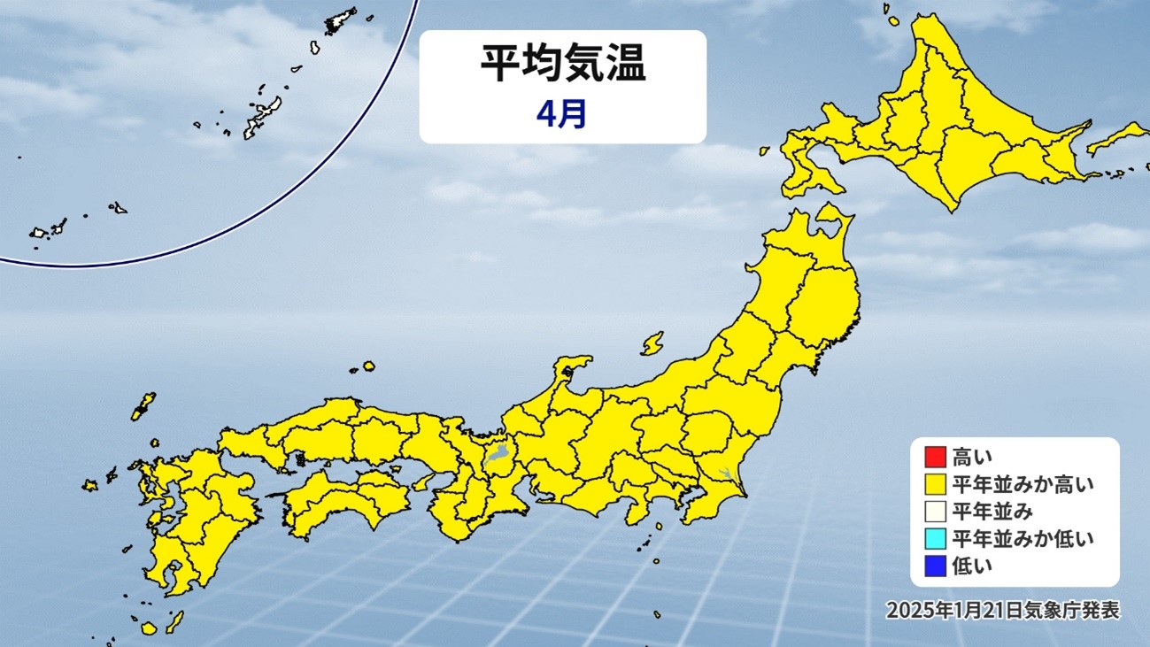さらに4月の平均気温を見ていきます。3月に続き、全国的に平年並みか高い予想となっています。今年の果樹の開花などは平年よりもだいぶ早まる可能性があります。また、いくら寒気の影響は受けにくいとしても、北日本などでは急に冷え込みが強まる日も数日間はあるでしょう。