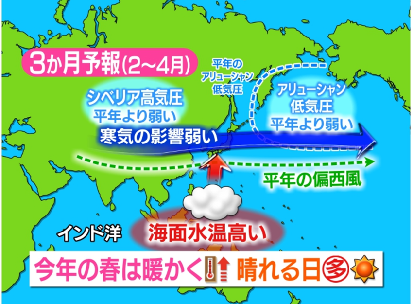 以上の事から、この先は日本に流れ込む上空の寒気の影響がだんだん弱まっていきそうなのです。今年の春は全国的に晴れる日が多く、雨が少なくいつもより暖かい日が多くなりそうです。