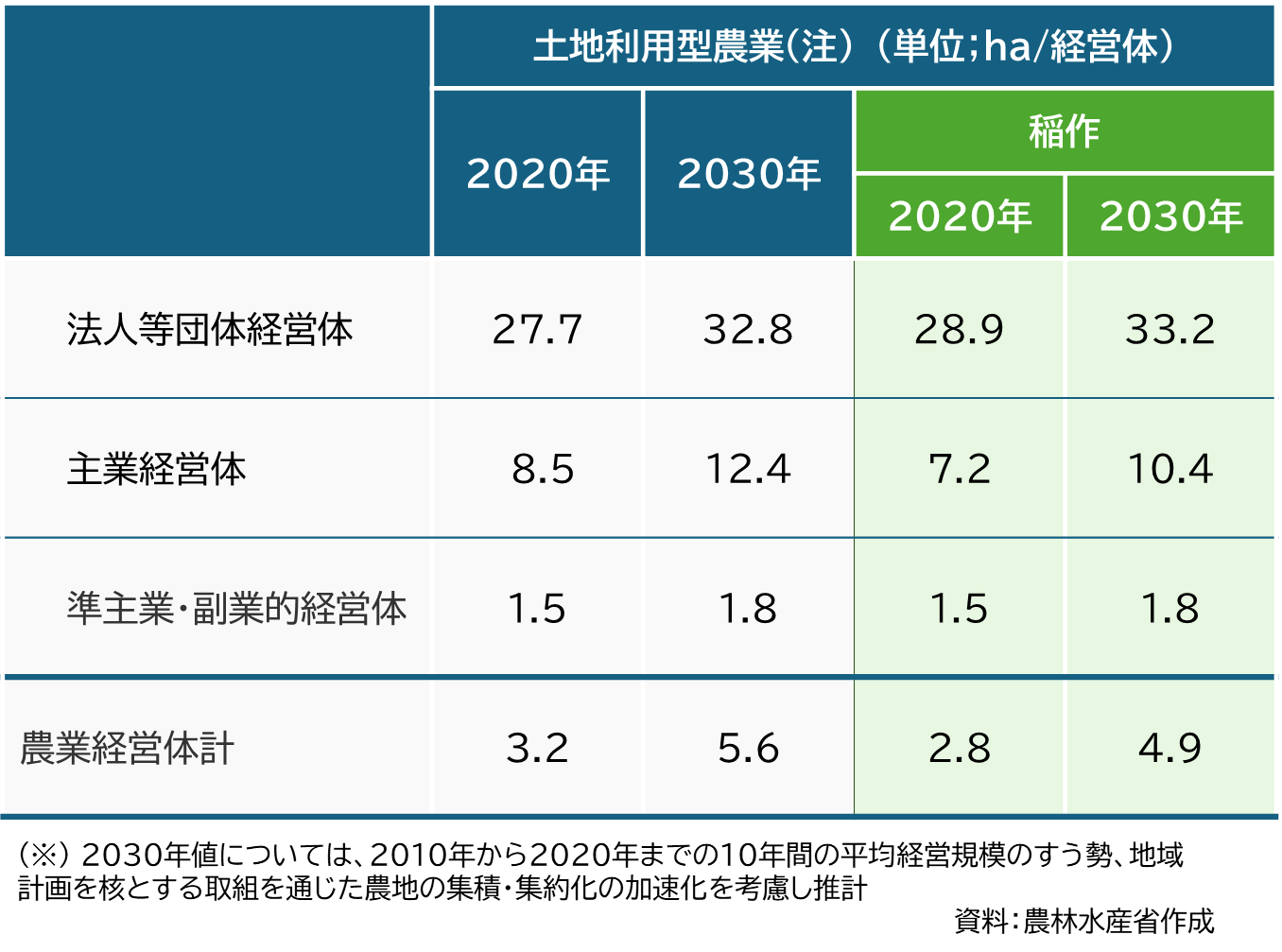 それには、離農農地を引き受ける担い手を始め、様々な関係者が将来に向けて一定の見通しを持って農地の集積・集約化に取り組めるように、主な耕種農業について2020年の実績値と比較する形で、2030年における経営形態別経営体数や平均経営規模の見通しが次のように示されています。