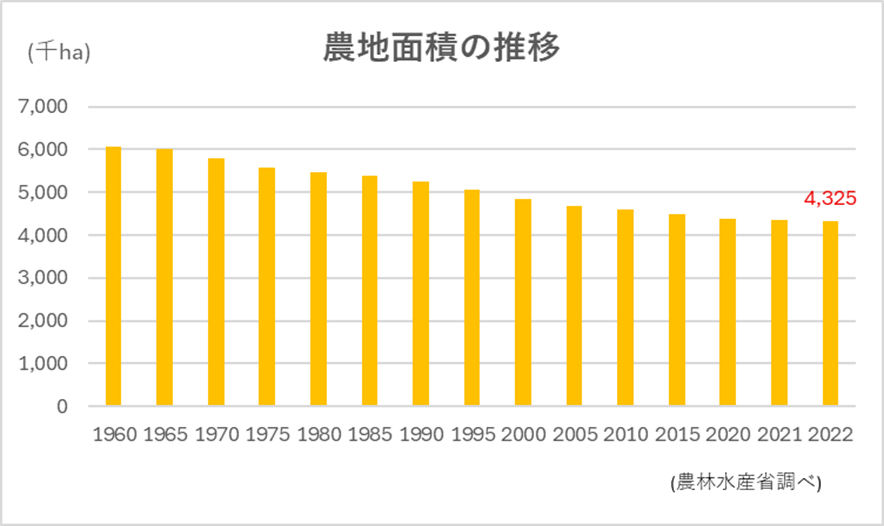 農地面積の長期的な推移を見ると、主に宅地等への転用と荒廃農地の発生等により、農地面積が最大であった1961年の609万haに比べこの約60年間で約179万ha減少(30%減)となっています。