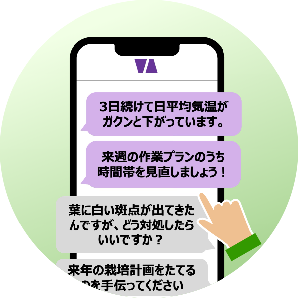 初月無料 指導員も使う東京大学発スタートアップの本格派AIが相棒に 月額880円(税込) 営農指導員も使う本格派AI。品目・地域に応じたアドバイスに加え、病害虫/雑草画像診断を搭載。よくある質問集、回答レベル選択も備え、栽培をサポート。 種苗・品種や気候・環境を加味した実践的な栽培情報が今すぐ"欲しい! 現象を正しく理解し、最適な対処(農薬/肥料/資材等)を実践したい! 従業員・外国人材も含め、組織として生産面をレベルアップしたい! 指導者、プロ農家、家庭菜園・貸農園。自分に合う内容の回答が欲しい。 01 栽培に関する実践的な情報が得られる 02 作物/地域/レベル設定で的確な回答を表示 03 翻訳、お気に入り登録など便利な機能 初月無料 栽培アシストAI 栽培に関わる全ての方の目標達成のために!東大発AIスタートアップ "きゅうりトマトなすび"とAgriweBが共創した栽培特化型AIサービスです。日々の栽培のお悩みに対し、即時に実践的な解決策を提示します。栽培アシストAI