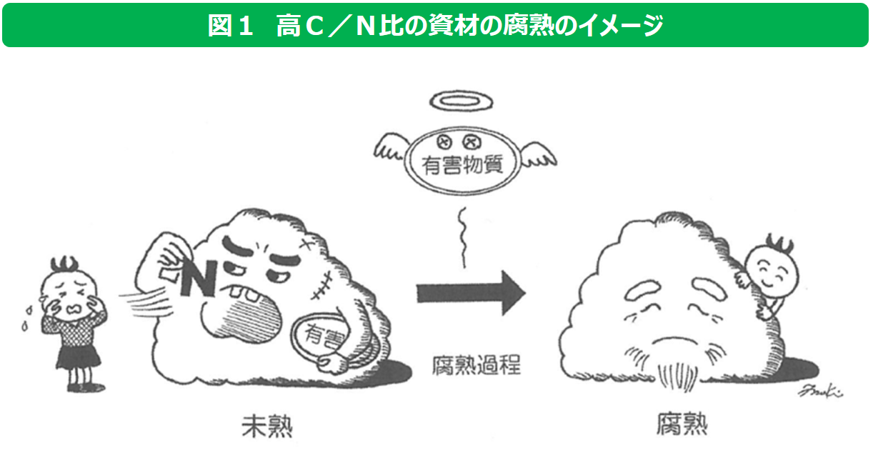 とくに、C/N比は有機物の分解と密接な関係があり、C/N比が高い(炭素が多めの)場合は注意が必要です。炭素分が多いと分解のために微生物が活発に増殖しますが、その場合に同時に微生物が必要とする窒素分が不足することになり、結果的に分解が遅くなってしまいます。