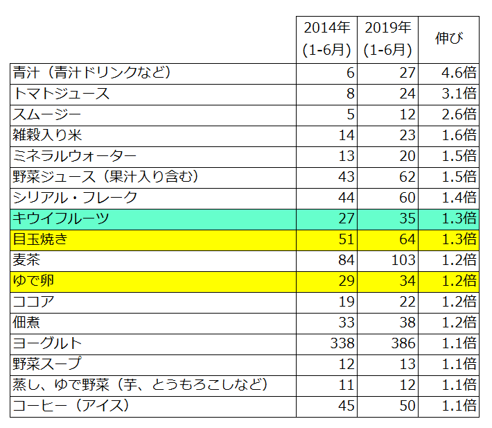 一方、卵料理として「目玉焼き」や「ゆで卵」も伸びていることが確認できます。卵も栄養価の高い食品として有名ではありますが、「卵焼き」や「スクランブルエッグ」のように調味料などを使ってひと手間掛ける料理よりは、素材の栄養をしっかり取れて、忙しい朝に少しでも時間を生んでくれるメニューが望まれているのではないでしょうか。
