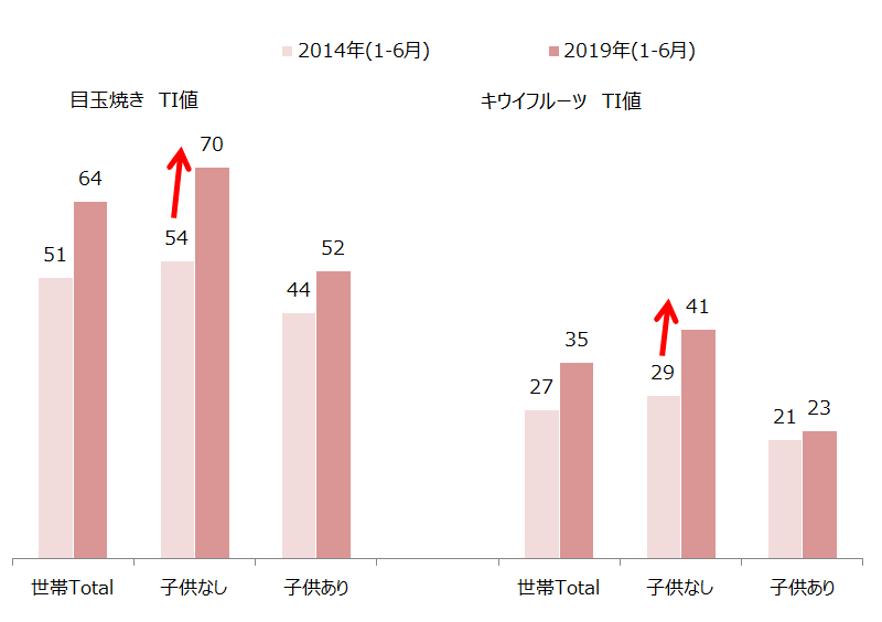 「目玉焼き」「キウイフルーツ」共に子供なし世帯で特に伸びていることが確認できました。