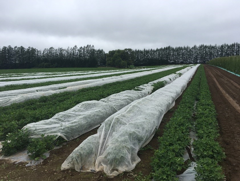 播種の頃(5月頃)の北海道はまだ地温が低く、さらに朝晩の冷え込みもあるので積算気温を稼ぐためにマルチを張り、パオパオ(不織布)をかけます(弊社でパオパオが何か知っているのは私一人かも(笑))。