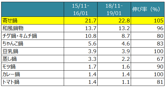 ここ3年で伸びている鍋メニューを見ると、最も食卓に並ぶ「寄せ鍋」のみが伸長していることが確認できます。「蒸し鍋」「トマト鍋」などの変わり種鍋の流行も一時的なもので、結局は定番・王道の鍋に回帰していることが伺えます。
