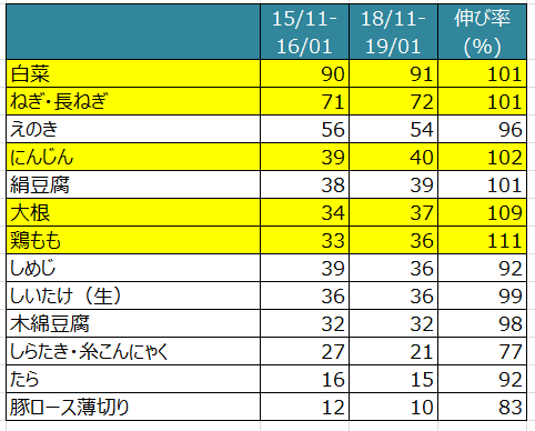 使用される具材を見てみると、きのこ類、こんにゃく、たら、豚ロース等の使用が低下している一方で、ビタミン豊富な彩りのある野菜類、低脂肪でタンパク質豊富な鶏もも肉が伸長しています。