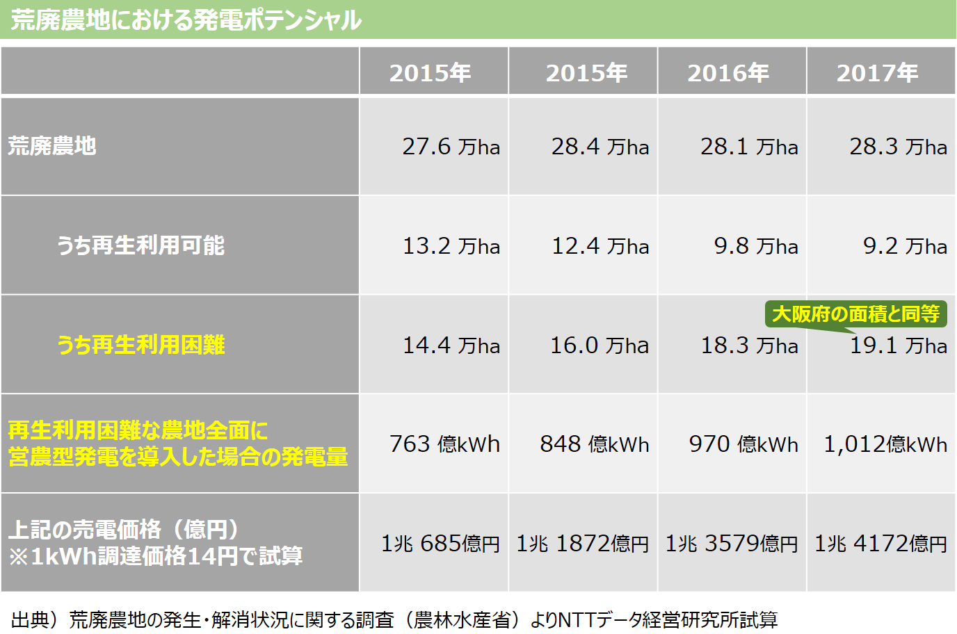 この割合で再生利用困難な農地全面に営農型発電を導入すると、1千億kWhの発電量となり、日本で発電されている電力の約10%に相当するのです。また、すべて14円/kWhで売電できたとすると1.4兆円の売電収入が得られると想定されます。