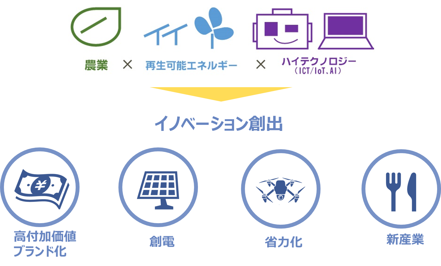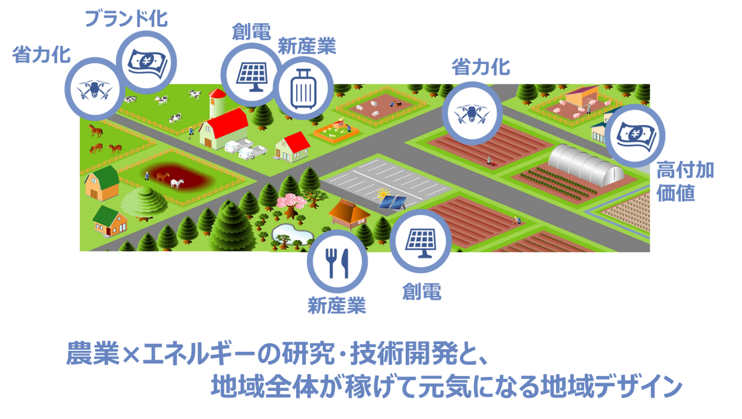 グリーンエネルギーファーム構想とは、農業に技術とエネルギーを融合させ、農業の情報産業化だけでなく、環境負荷低減と収益性向上を図り、地域社会の活性化につなげるという構想です。