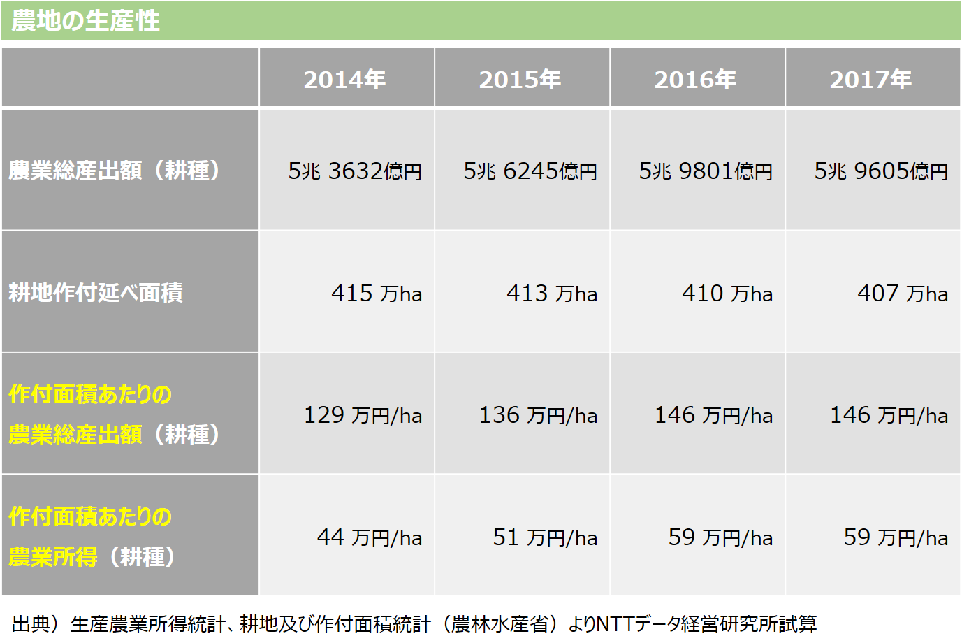 農業の生産性を考える場合、農地当たりの生産性、労働時間あたりの生産性、投資額当たりの生産性など、様々な指標が考えられますが、今回は農地に注目した生産性を見てみたいと思います。