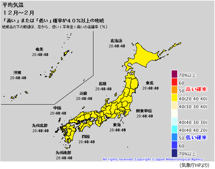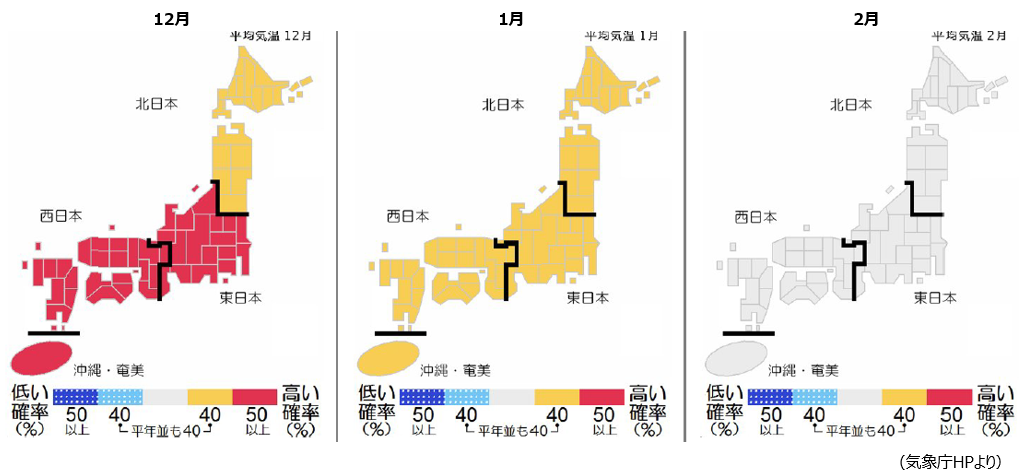 12月は特に西日本・東日本で暖かく、1月は平年並か暖かい予想、2月は平年並みとなっています。