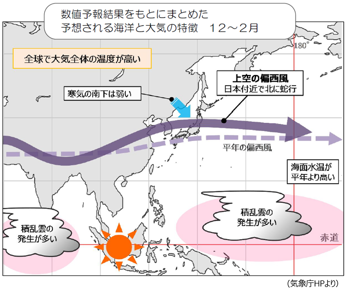 全般的な流れを説明すると、日本付近の上空を流れる偏西風が平年よりも北側を流れる予想のため、寒気が日本付近に流れ込みにくくなりそうです。また西高東低の冬型の気圧配置も長続きしない予想となっています。