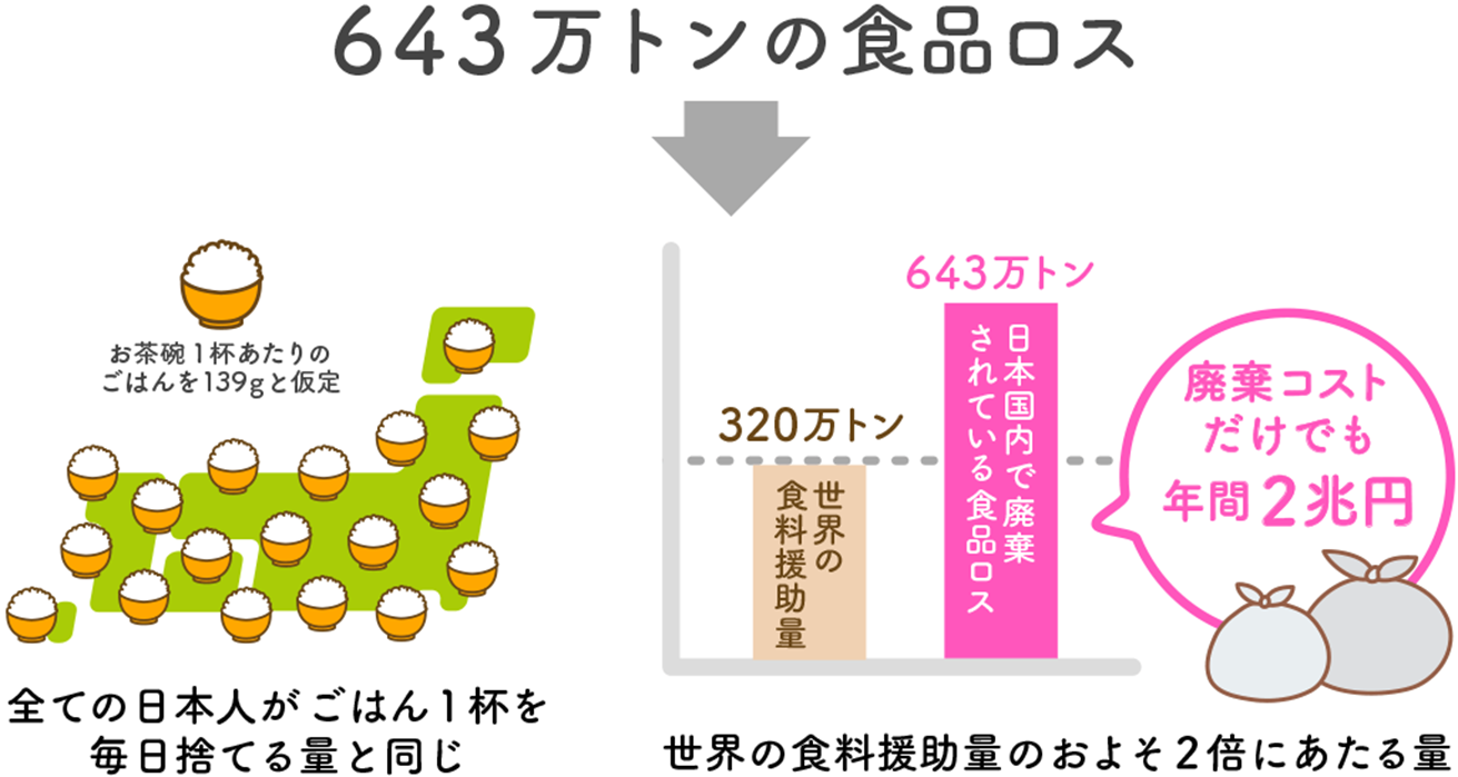食品ロスとは、食べられるのに捨てられてしまう食べ物を指し、日本では年間643万トン*もの食品ロスが発生しています。これは世界で飢餓に苦しむ人々への食糧支援量約380万トン**に比べても1.7倍と非常に大きな数字となっています。