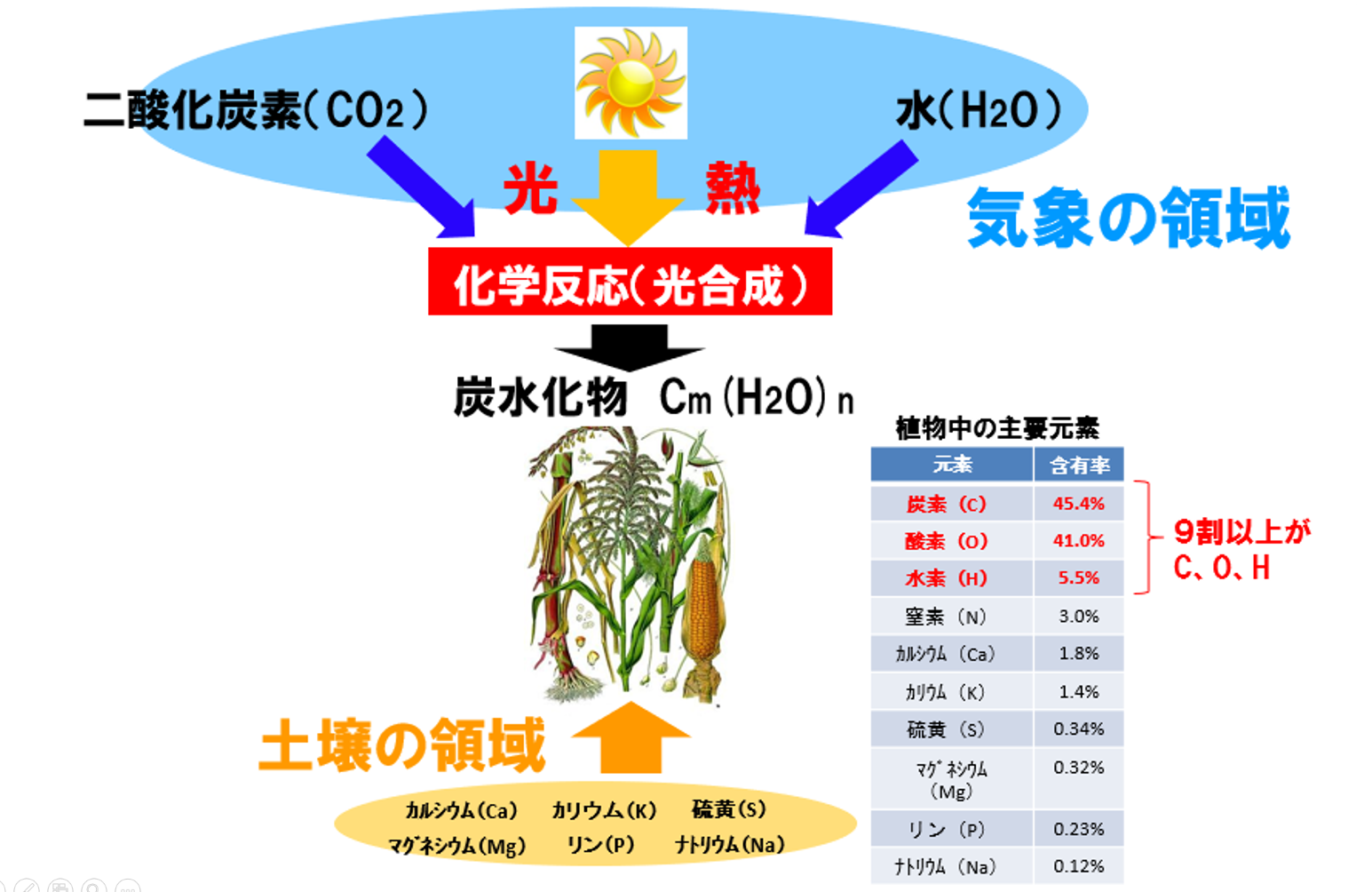 私が言うまでもないことですが、植物の約92%は炭素(C)と水素(H)と酸素(O)で成り立っています。いわゆる“炭水化物”です。