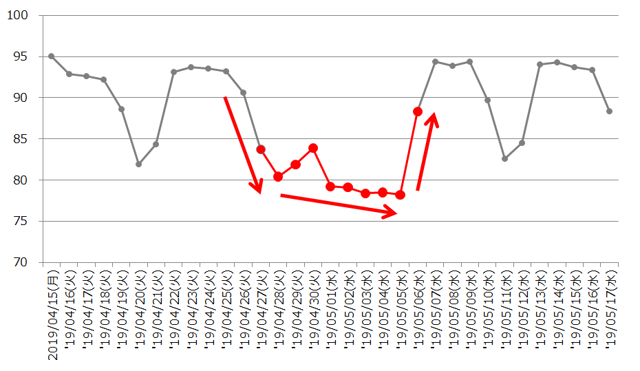 ちなみに4月30日は営業している企業もあったようですし、平成最後の夜を自宅で過ごすなどもあったのか、内食率が一時的に高まった様子が見えました。
