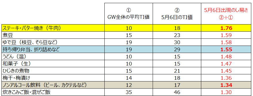それでは、注目の5月6日に出現しやすいメニューを「キッチンダイアリー」の出現率(TI値)で確認してみましょう。GW全体の平均TI値と比較した際に、倍率が大きい順(出現しやすい)に10メニューを確認しました。