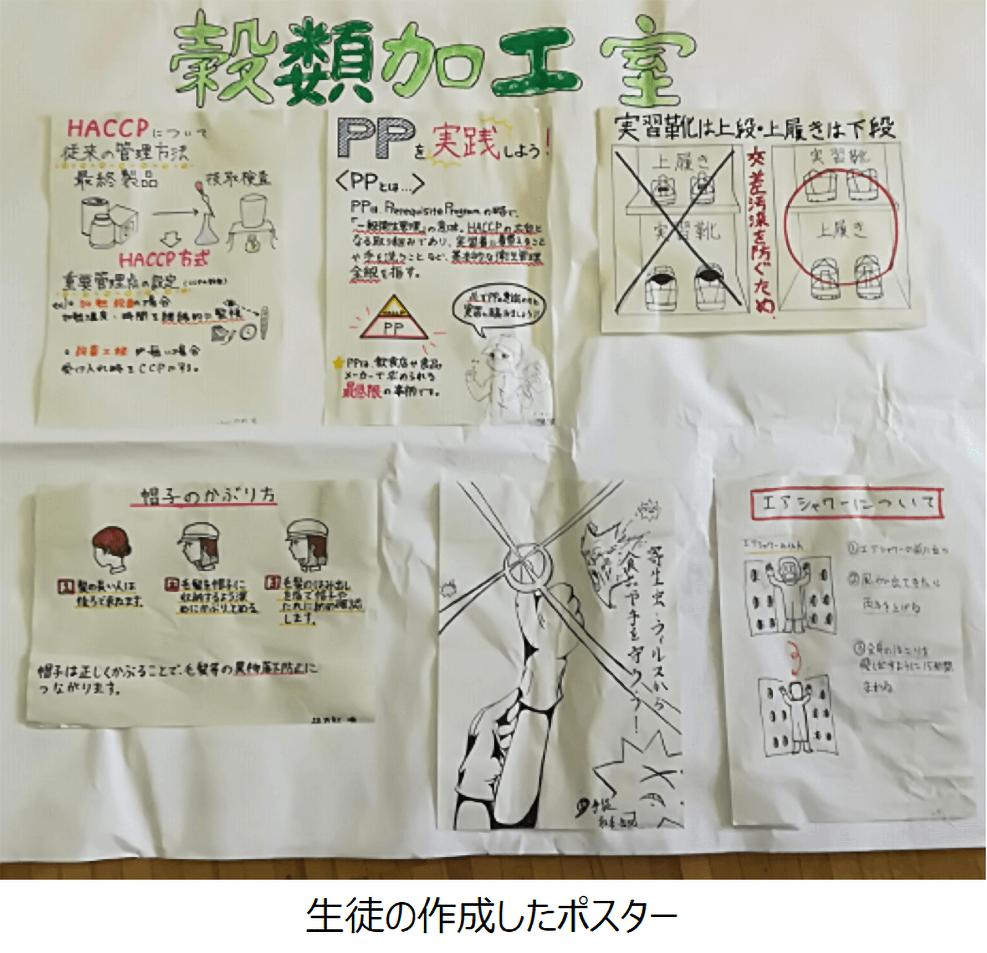 生徒たち自らが作ったHACCPに関する説明や注意事項を実習室に張り出すことで、食品衛生や食品安全への意識を高めています。