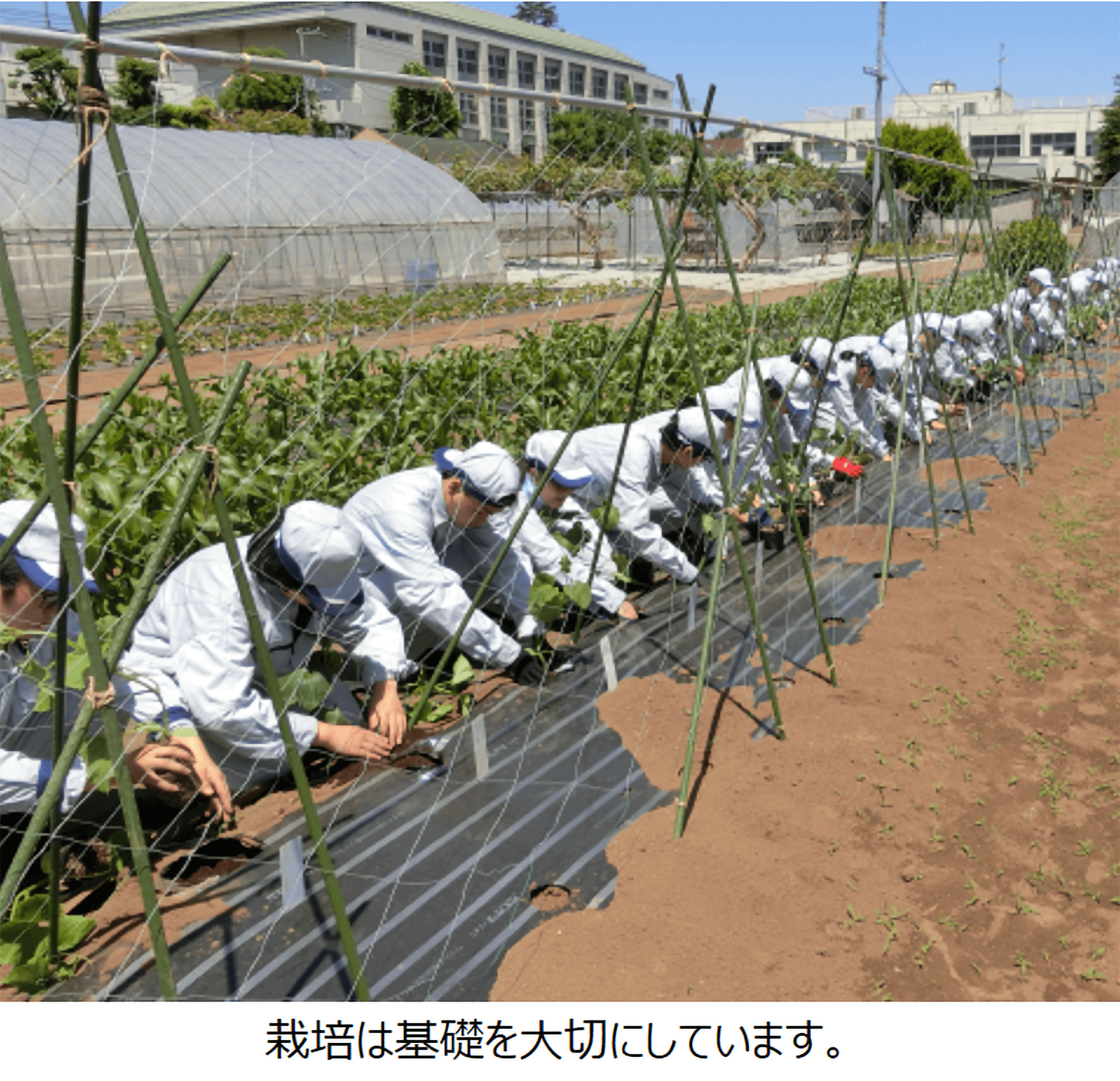 本校は、東京都杉並区にあり、周囲は住宅街です。しかし、東京都23区にも露地や施設を中心に野菜や果樹を栽培する農家がありますし、大規模ではありませんが少量多品種を栽培し農協への出荷と直販とを併合して行っています。
