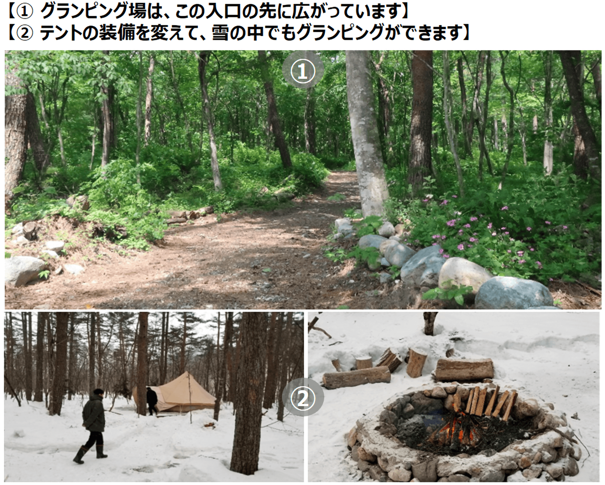 当社グランピングのセールスポイントは、できる限り自然を残した森の中でキャンプができること、当社の畑で採れた野菜や米、白馬の地で生産された肉などを食べられること、そして農業体験ができることです。