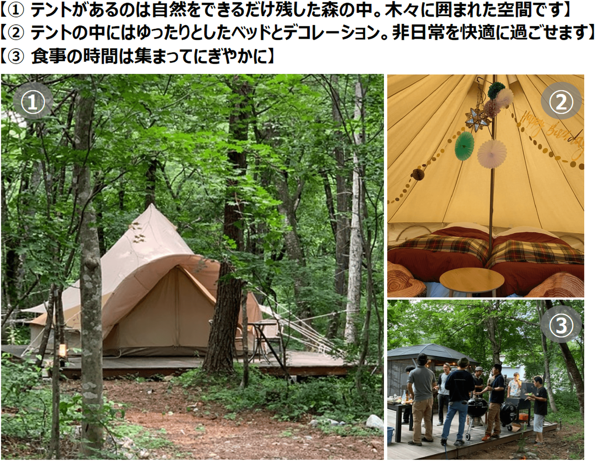 (注)グランピング(Glamping):グラマラス(魅力的な)とキャンピングを掛け合わせた造語。テント設営や食事の準備などの煩わしさから旅行者を解放した「良い所取りの自然体験」(出展「一般社団法人日本ブランピング協会」HP)