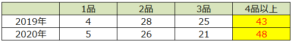 2019年→2020年と比較した際に、ホットケーキと一緒に出されるメニューの数が増えていることが分かります。