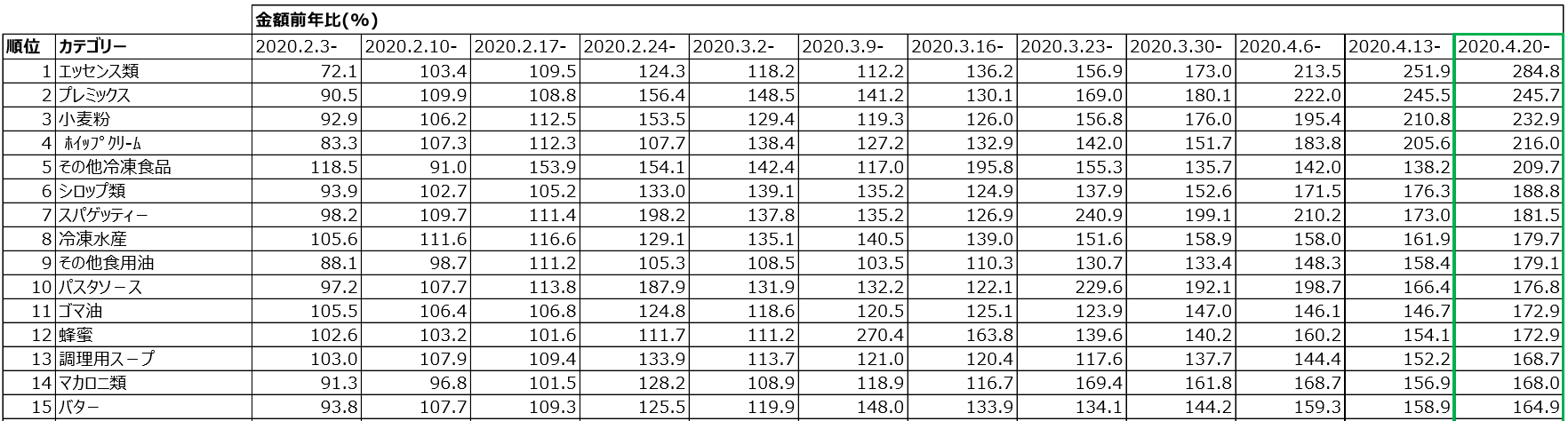 インテージの小売店POSデータ「SRI」(全国約3,000店)で直近の食品の売上動向を確認したところ、緊急事態宣言が発令された4月以降は、エッセンス類(バニラエッセンス、ベーキングパウダーなど)やプレミックス(ホットケーキミックス、お好み焼き粉など)、小麦粉など手作りお菓子・パン関連の商品が大きく伸長していることが分かります。