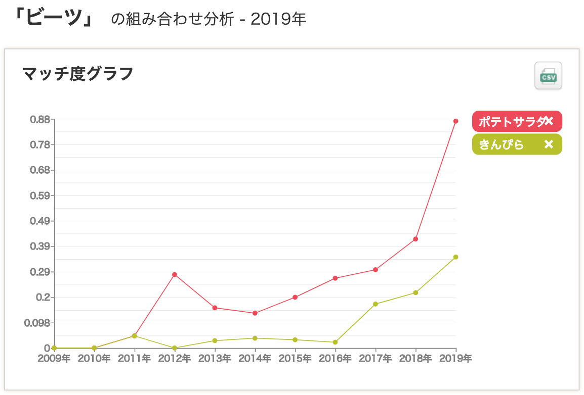 ビーツと一緒に検索されているキーワードをみてみると、「下処理」が最も多くなっています。数年前までは缶詰が一般的でしたが、近年店頭でも手に入るようになり、下処理方法が検索されていることがわかります。また、メニューキーワードでは「ボルシチ」「スープ」「サラダ」系が上位となっています。見映えのする「ポテトサラダ」や、下処理のいらない「きんぴら」などの伸長率が高くなっているのが特徴的です。