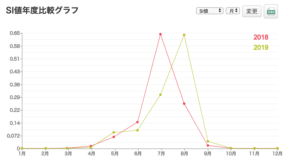 ●「夏バテ(夏バテ予防)」の検索頻度(2019年・2018年/月別)