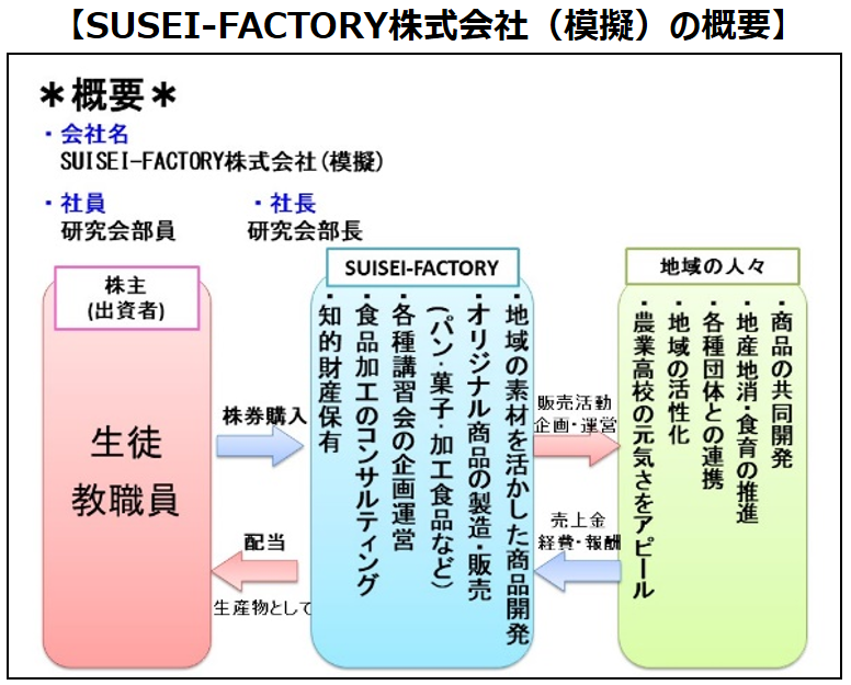食品科学研究会では、地域農業の6次産業化支援を通じた地域の活性化を目指し、2012年に、模擬株式会社「SUISEI-FACTORY」を起業し、地域農業関係者と商品開発や普及啓発イベントへの参加協力など、多彩な活動をプロジェクト活動と関連させて実践しています。