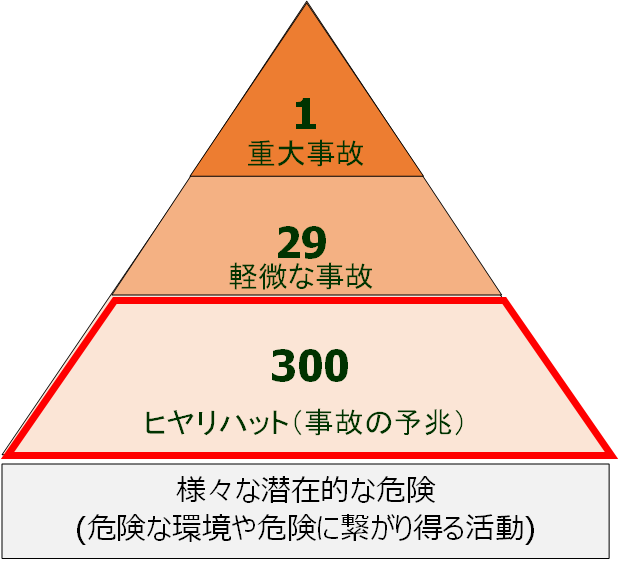 これは、アメリカの保険技師ハインリッヒが発見した法則で、「1件の重大事故や重大災害(死亡事故など休業につながる災害)の背景には29件の事故(休業には至らない負傷事故)があり、さらにその背景には300件のヒヤリハット(微小災害:負傷には至らなかったが、ヒヤッとした、ハッとした体験)が発生している」ことを統計的に証明したものです(下図参照)。