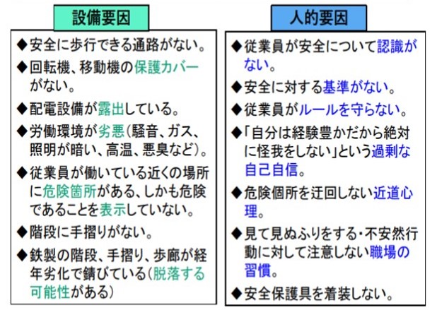 その労働災害の要因は大きく設備要因と人的要因に分類され(下図参照)、これらを排除するために問題をいかに早く発見し、解決(予防)していくかという活動が安全活動と言えます。