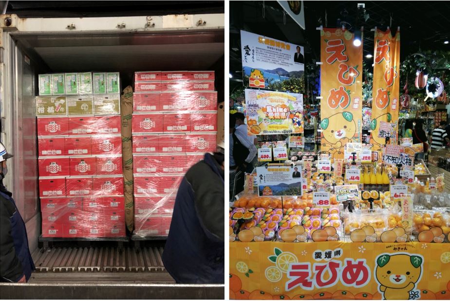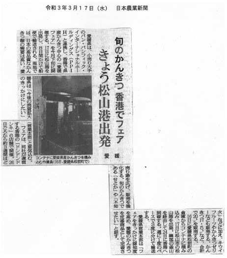 暗い話が続いてしまいましたので、最後に明るい話題をお届けします。PPIC会員さまである宇和島プロジェクトさま、サンマルシェさまのご協力により、3/17に香港で開催された 『愛媛県柑橘フェア』に向けた商品が松山港から初めて出荷されました。この取り組みは当日のニュースや日本農業新聞にも取り上げられ地元では大きな話題となりました。