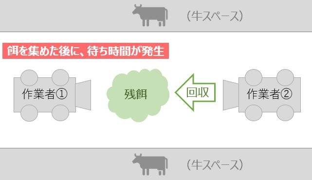 この際、作業者①が残餌を集めた後、作業者②が残餌を回収するまで手待ち時間(10〜20分程度)が発生していました。これは本作業の前に二人の作業者が別々の離れた場所で作業しているため、残餌収集(作業者①)と回収(作業者②)のタイミングを合わせる難しさから発生する手待ちのムダと言えます(下図)。