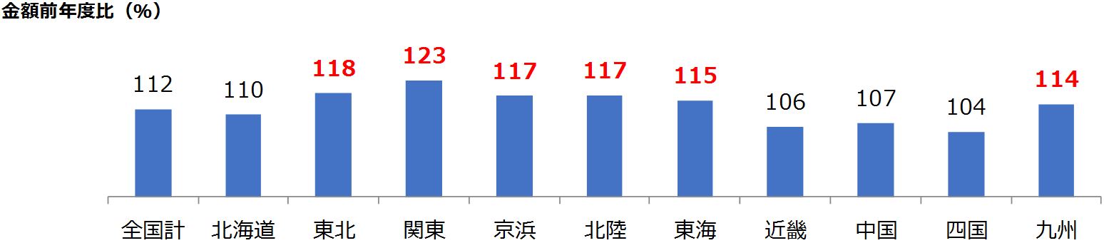 エリア別の前年度比をみると、関東・東北・北陸など東日本を中心に大きな伸びがみられる一方で、近畿・中国・四国では伸びが小さくなっています。