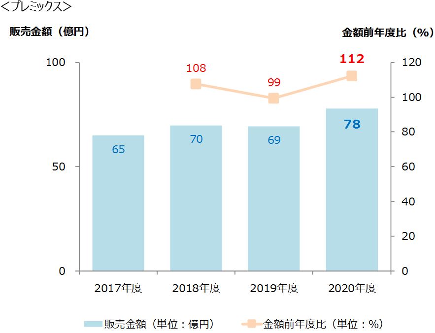 2020年度の前年度比をみると、お好み焼き用のプレミックスが112%、ソースが109%と増加しており、コロナ禍の巣ごもり需要によりお好み焼き市場が拡大していることが分かります。