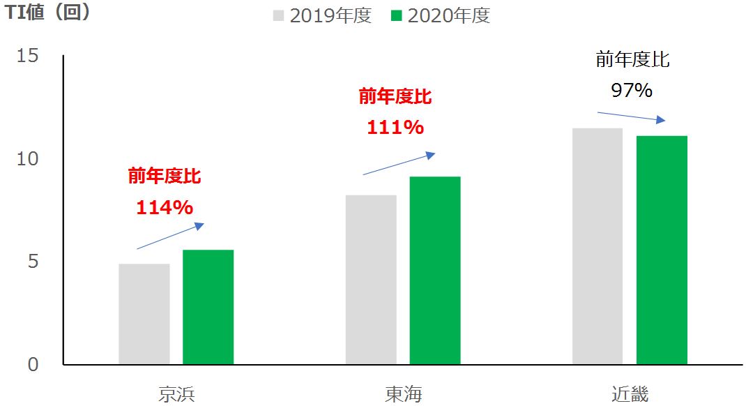 前年度比をみると、京浜が114%、東海が111%と2桁増となっている一方で、もともとTI値の水準が高かった近畿では97%となり食卓に並ぶ回数はやや減少しています。