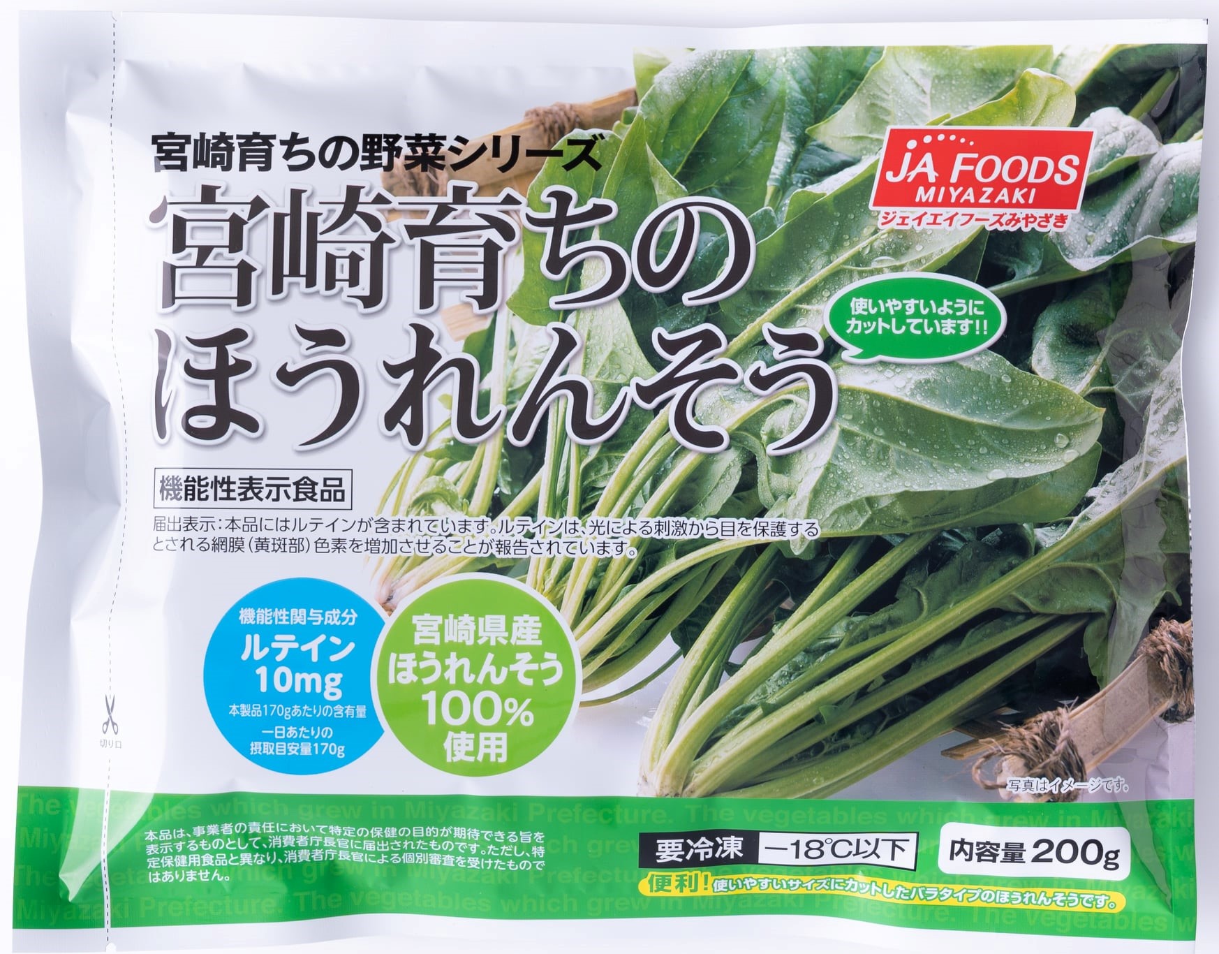 完全契約栽培により、収穫後新鮮なうちに冷凍加工された宮崎県産のほうれんそう