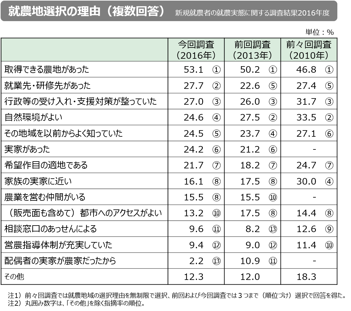 ところで、全国新規就農相談センターが2016年度にまとめた『新規就農者の就農実態に関する調査結果』によれば、就農地の選択理由(3つまで回答)をみると、前回(2013年)、前々回(2010年)の調査結果と同じように、「取得できる農地があった」が最も多く(表参照)、農地取得の可否が就農地の選択に最も大きく影響していることが明確です。