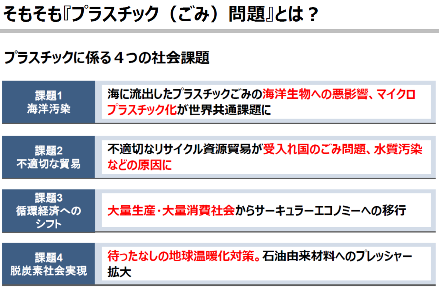 トレー・包装の分野は、環境問題からもSDGsからもその使用量の多さから、「プラスチック問題」が最重要課題とされています。図1に示した通り、プラスチックが係る社会問題は大きく4つあり、海洋汚染・不適切な貿易・循環経済・脱炭素社会です。