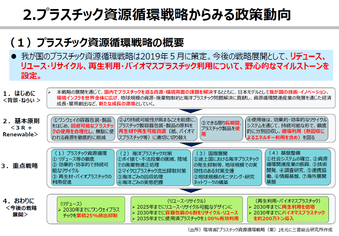 それを受けた環境省の政策動向が、図2の「プラスチック資源循環戦略」の概要です。なんとなく分かったような。。。気がしていただければ良いのですが。