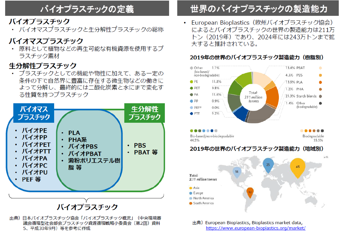 バイオマスとは、生物資源(bio)の量(mass)を表す概念で、原料として植物などの再生可能な有機資源を使用するプラスチック素材です。プラスチック資源循環戦略でも再生可能資源として紙同様に推進しており、2030年までに200万トン導入を目標にしています。