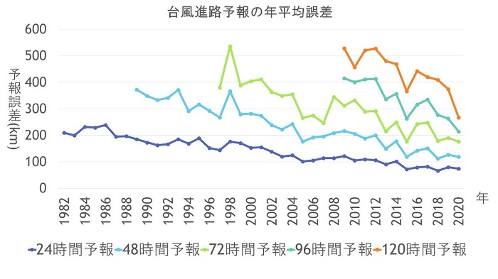 私は1985年生まれですが、当時の台風予報は24時間先までしかなく、その進路の誤差は約230kmでした。それが2020年には24時間進路予報の精度は約70km、また5日先まで予報期間ものびました。気象災害を完全に防ぐ事は難しいですが、台風情報は以前に比べればかなり予報精度が上がってきています。