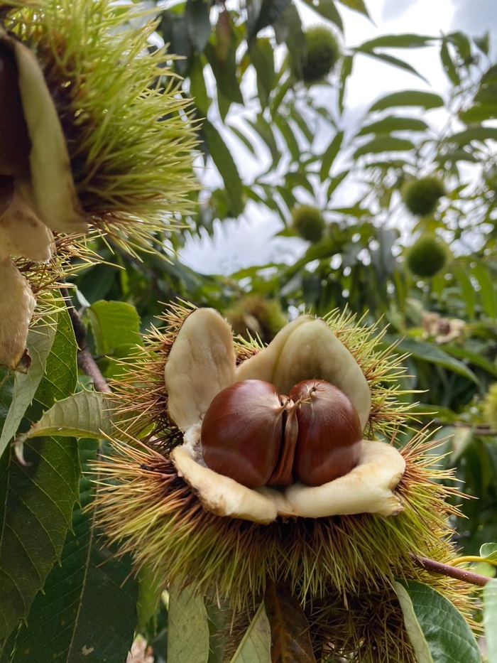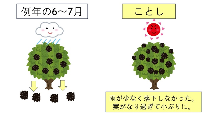 今年の栗は6〜7月にかけて雨が少なく、小ぶりの物が多くなってしまったというのです。どういう事かというと、雨によって本来なら生命力の弱い実は落ちていくはずなのですが、全然雨が降らなかったので落ちる事なく、実がなり過ぎてしまったというしくみです。
