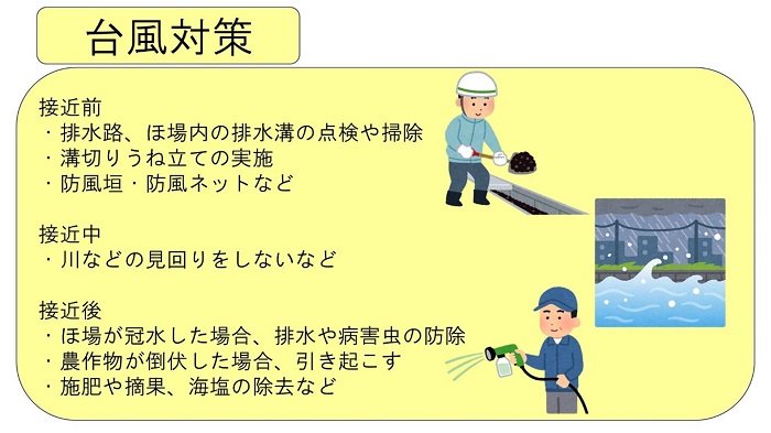 ・ほ場が冠水した場合は、すみやかに排水や、病害虫の防除。