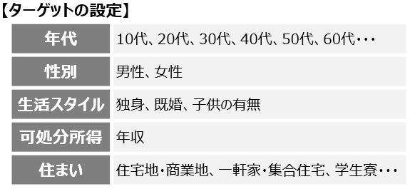ターゲットの項目に間違っても、「お子様からお年寄りまで男女を問わず美味しく召し上がっていただけます」などと書かないでくださいね。