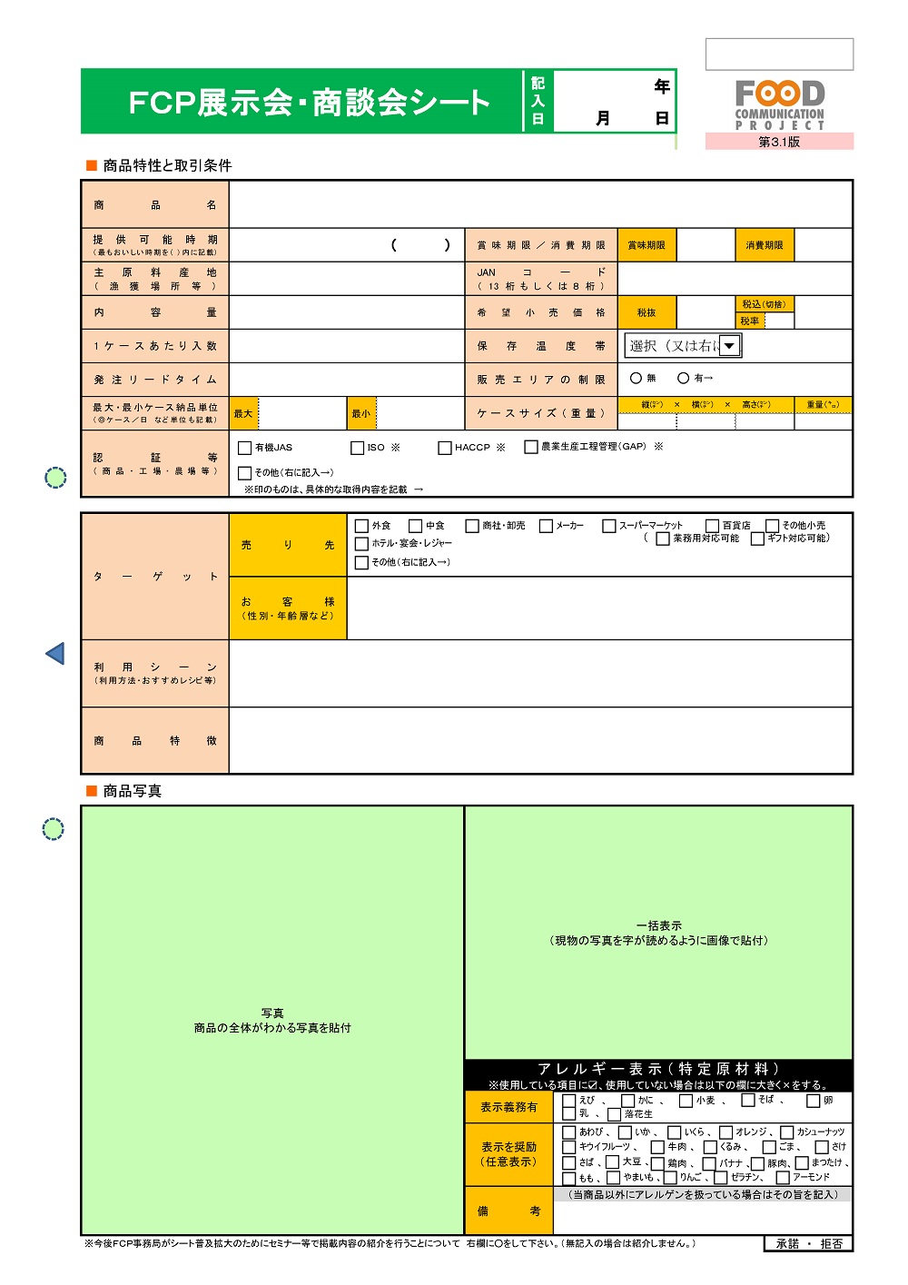 その取り組みの中で、展示会・商談会出展者の「伝えたい情報」と、バイヤーの「知りたい情報」を1枚にまとめることで、効率的に商談を進めることを可能にした統一シート『FCP展示会・商談会シート』(現在は第3.1版)ができました。