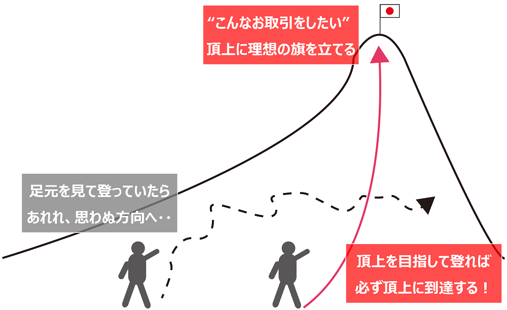 一方、図の右側の人のように山の頂上に “こんなお取引をしたい” という理想の旗を掲げていれば、左側の人のように足場が悪くても(悪い出来事があっても)、必ず山の頂上に到達できます。皆さんには“こんなお取引をしたい”という理想の旗(理想のイメージ)を、山の頂上に立てて欲しいのです。