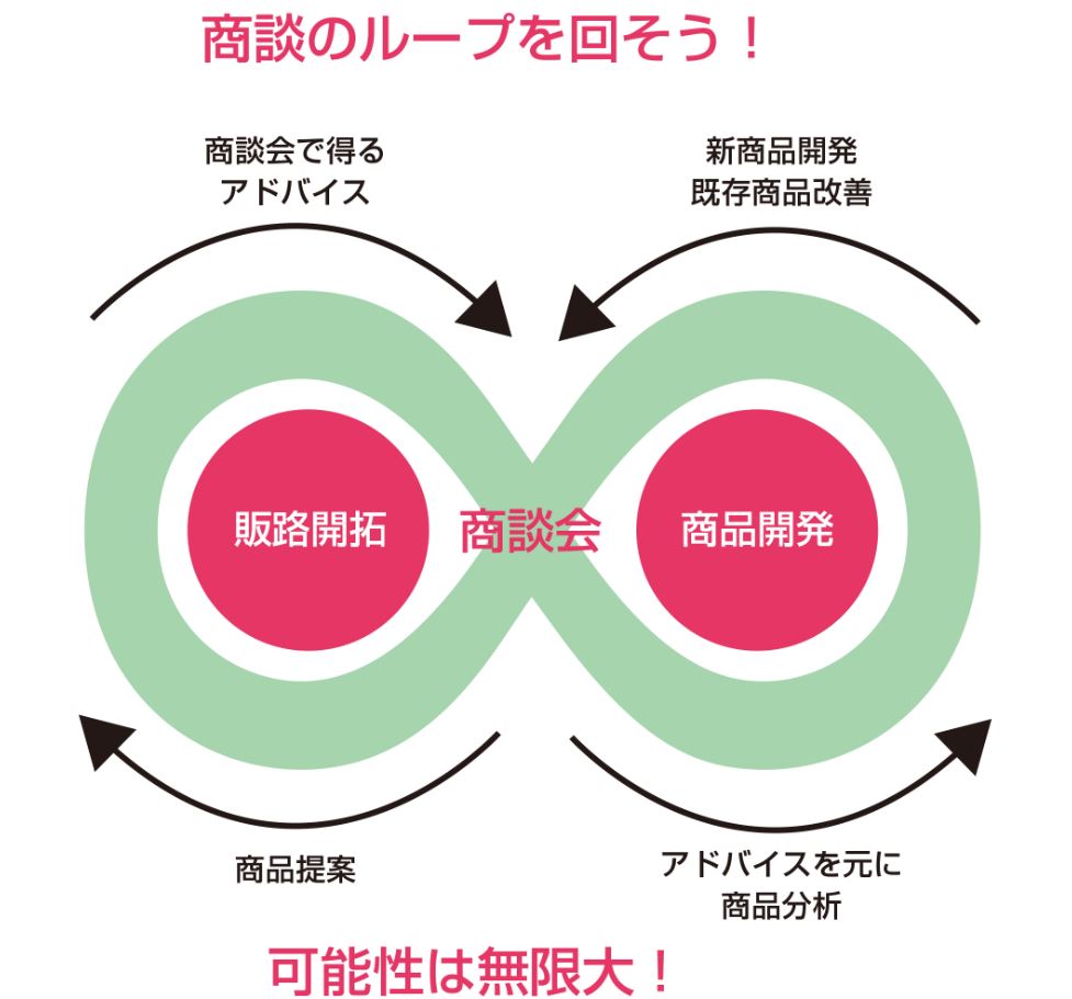 なぜなら、皆さんが“売りたいモノ”と“売れるモノ”は違っています。そして、“売れるモノ”はいつも変化しています。だからこそ、“売れるモノ”を知っているバイヤーから「商品A が作れるのなら商品B を作れませんか?」という“売れるためのヒント”をもらい、常に商品開発と販路開拓のループを回し、皆さんの“売りたいモノ”を売れるモノ”に変えていって欲しいのです。