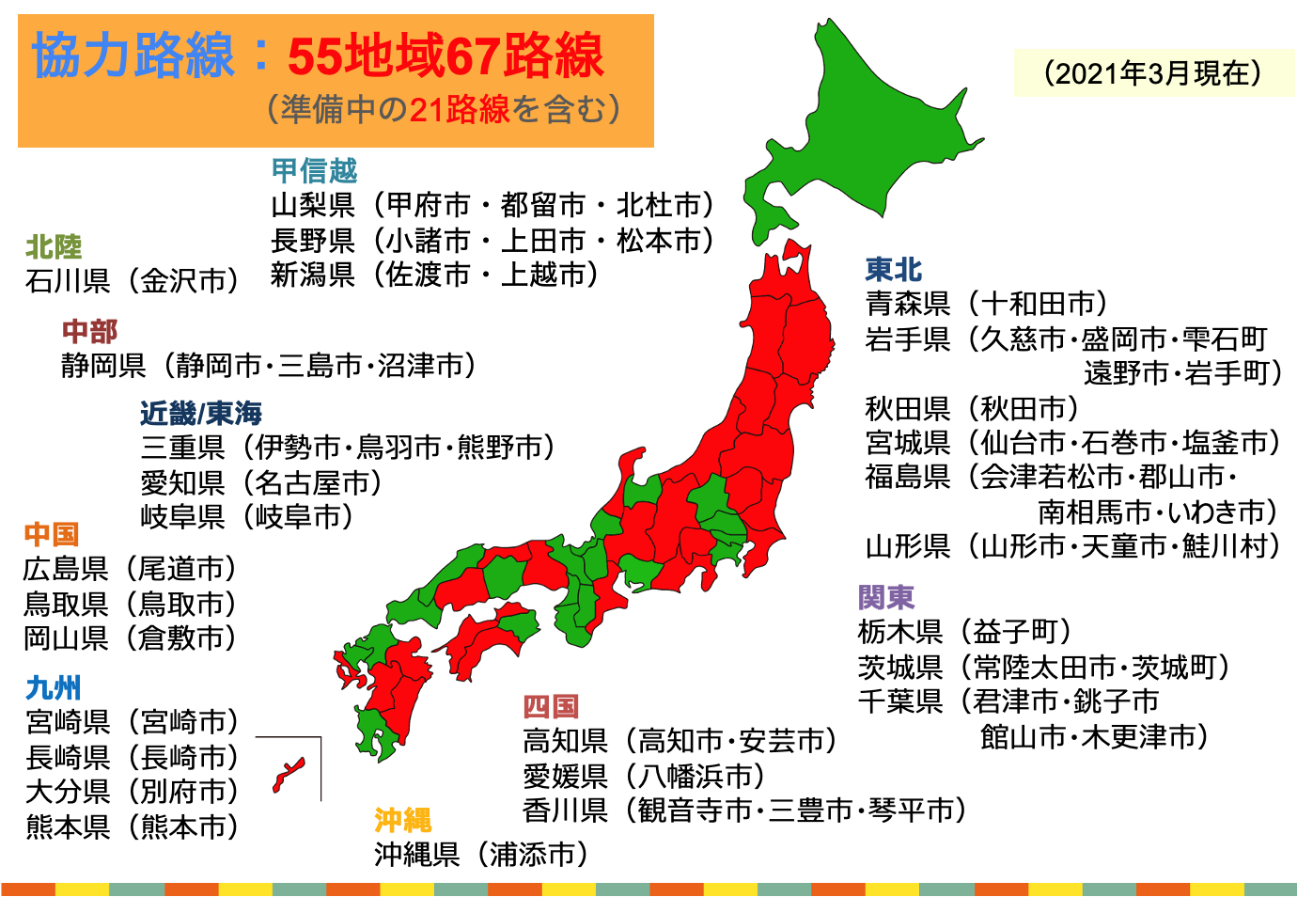 高速バス会社と協力し開発した路線は全国に広がり、2021年8月時点でバス会社25社と契約、全国55地域67路線まで拡大しています。さらに、専用の保冷ボックス「あいのりボックス」を利用し、常温・冷蔵・冷凍の同時一括配送ができるようになりました。