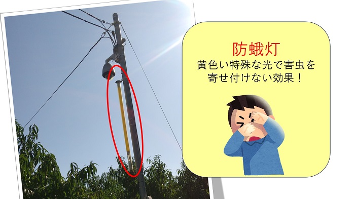 さらに畑を歩くとなにやら怪しい蛍光灯のようなものを発見しました。これは、「防蛾灯」というもので、黄色い特殊な光を発し、野菜や果樹を傷める原因となる害虫を寄せ付けない効果があります。